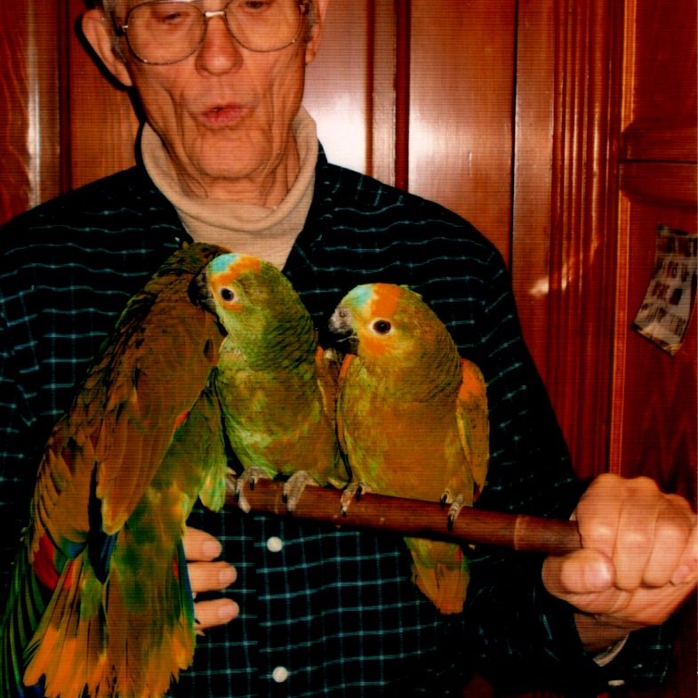 In addition to teaching, there were many other interests, all of which Jim embarked upon with the typical gusto that epitomized this one-of-a-kind man of science. A pair of cockatiels grew into a large breeding flock of hand-fed cockatiels, parakeets and finches, a menagerie that soon expanded to include African Grey, Amazon and Blue and Gold Macaw parrots . . . much to Rhea’s dismay. The basement aviary and growing tropical fish hobby, complete with dozens of primarily hand-made flight cages and tanks, led to regular Saturday family sales runs into Aurora and Chicago pet shops, the proceeds of which financed Liana’s private liberal arts college education.